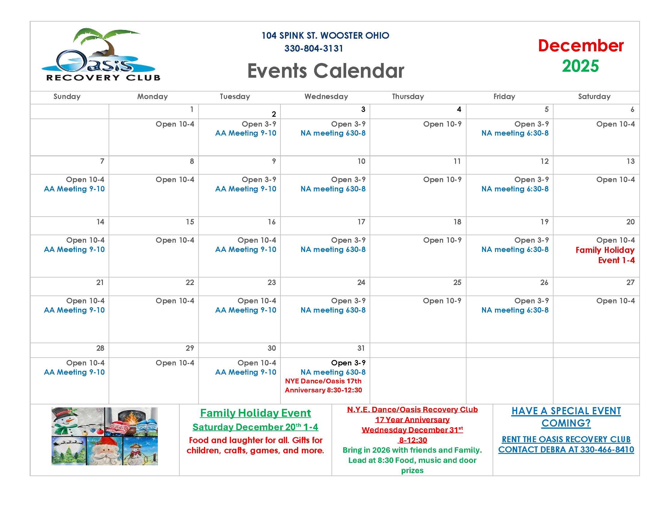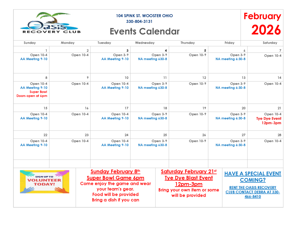 The Oasis Recovery Club also hosts themed events (New Year’s Eve Party, Superbowl Party) and family friendly gatherings (Easter Egg Hunt, Summer Picnic).